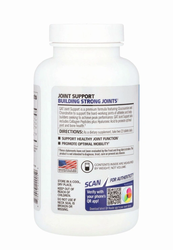 GAT Joint Support is a premium formula featuring Glucosamine and Chondroitin to support hardworking joints of athletes and bodybuilder seeking to achieve peak performance. GAT Joint Support also includes Collagen Peptides plus Hyaluronic Acid to promote optimal joint and bone health.