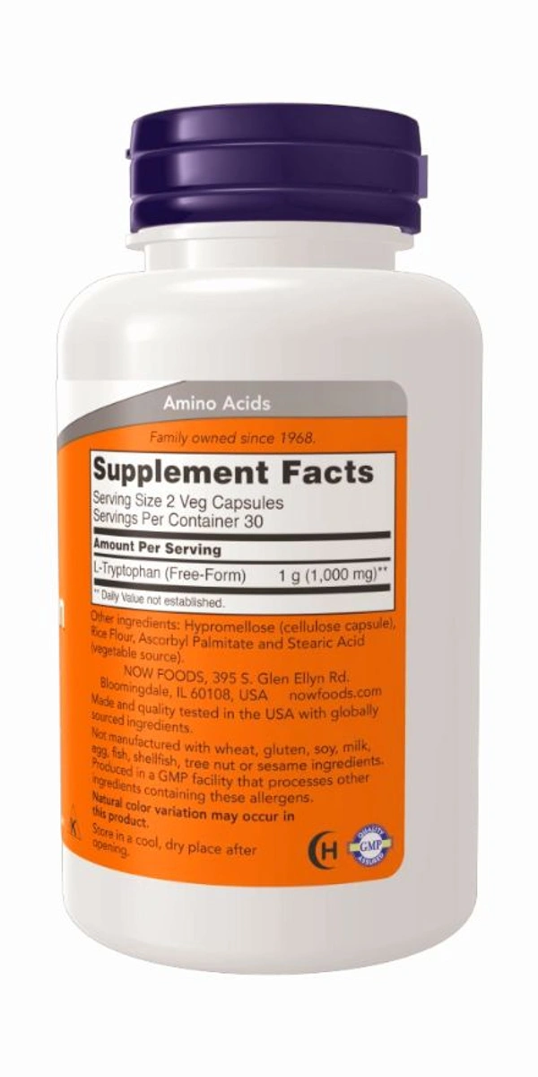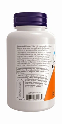 L-Tryptophan is an essential amino acid; therefore, it is not synthesized by the body and must be obtained from the diet.* L-Tryptophan is critical for the production of serotonin and melatonin, which help to support a positive mood, healthy sleep patterns, and proper immune system function.* Every lot of NOW® L-Tryptophan is tested to be free of Peak E and microbial contamination.