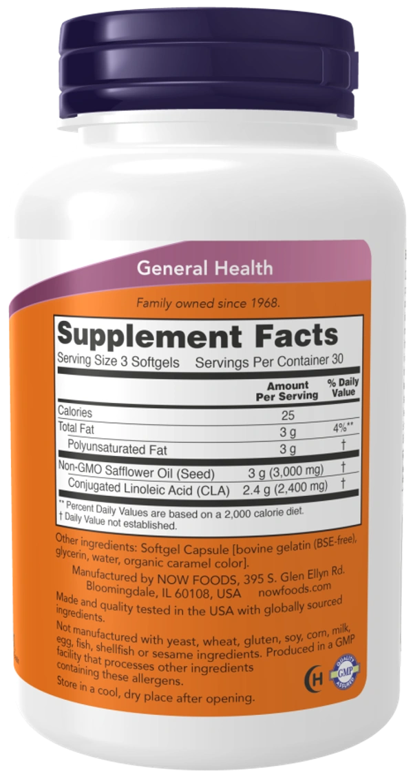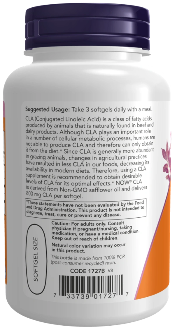 CLA (Conjugated Linoleic Acid) is a class of fatty acids produced by animals that is naturally found in beef and dairy products. Although CLA plays an important role in a number of cellular metabolic processes, humans are not able to produce CLA and therefore can only obtain it from the diet.* Since CLA is generally more abundant in grazing animals, changes in agricultural practices have resulted in less CLA in our foods, decreasing its availability in modern diets. Therefore, using a CLA supplement is recommended to obtain desirable levels of CLA for its optimal effects.* NOW® CLA is derived from Non-GMO safflower oil and delivers 800 mg CLA per softgel