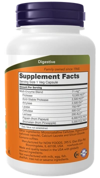 NOW® Plant Enzymes is a comprehensive blend of enzymes that helps to support proper digestion.* This product's combination of enzymes assists in the breakdown of fats, fiber, proteins, and carbohydrates, thus optimizing the availability of nutrients in the food you eat.* NOW® Plant Enzymes also includes lactase to support the digestion of dairy products for those who are sensitive to lactose