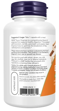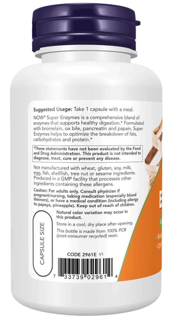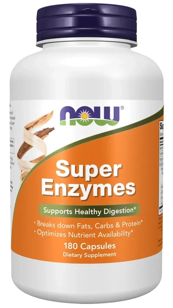 NOW Super Enzymes is a comprehensive blend of enzymes that supports healthy digestion.* Formulated with bromelain, ox bile, pancreatin and papain, Super Enzymes helps to optimize the breakdown of fats, carbohydrates and protein.*