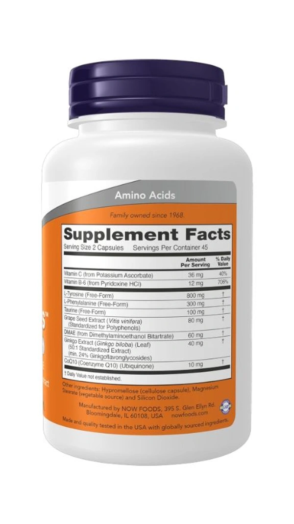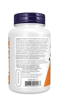 Norepinephrine and dopamine are key neurotransmitters for the maintenance of alertness and mental acuity and for promoting a feeling of general well-being.* These two neurotransmitters are produced in the body from the amino acid precursors L-tyrosine and L-phenylalanine.* This conversion process also requires vitamins C and B-6 as cofactors.* NOW® True Focus™ combines these important nutrients with other ingredients like Ginkgo biloba and DMAE to complement this formula.*