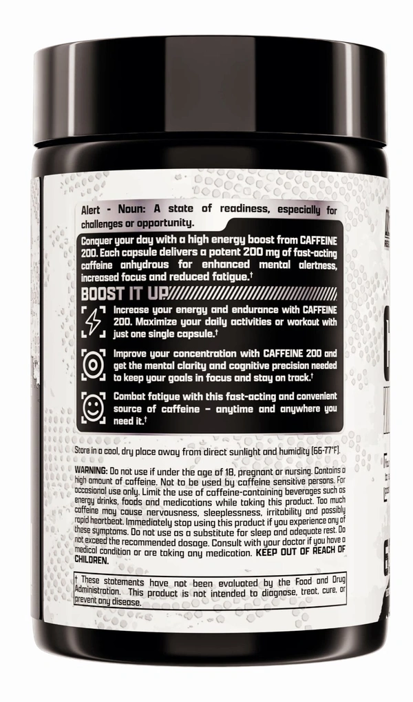 Conquer your day with a high energy boost from CAFFEINE 200. Each capsule delivers a potent 200 mg of fast-acting caffeine anhydrous for enhanced mental alertness, increased focus and reduced fatigue.